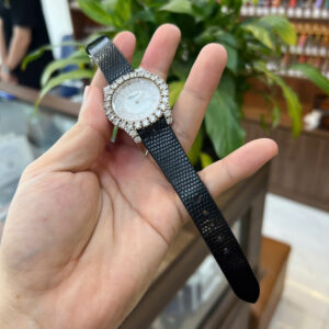 Chiếc Chopard L’Heure Du Diamant – tuyệt phẩm trị giá hơn 1 tỷ đồng với thân vỏ vàng trắng 18K và viền đính kim cương tự nhiên – đã được chủ nhân tin tưởng mang đến ALOWATCH để thay mới bộ dây đồng hồ Chopard theo phong cách thủ công cao cấp. Chất liệu được lựa chọn là da kỳ đà màu đen, nổi bật với vân da độc đáo, được hoàn thiện bởi bàn tay của những nghệ nhân lành nghề tại xưởng da ALOWATCH.