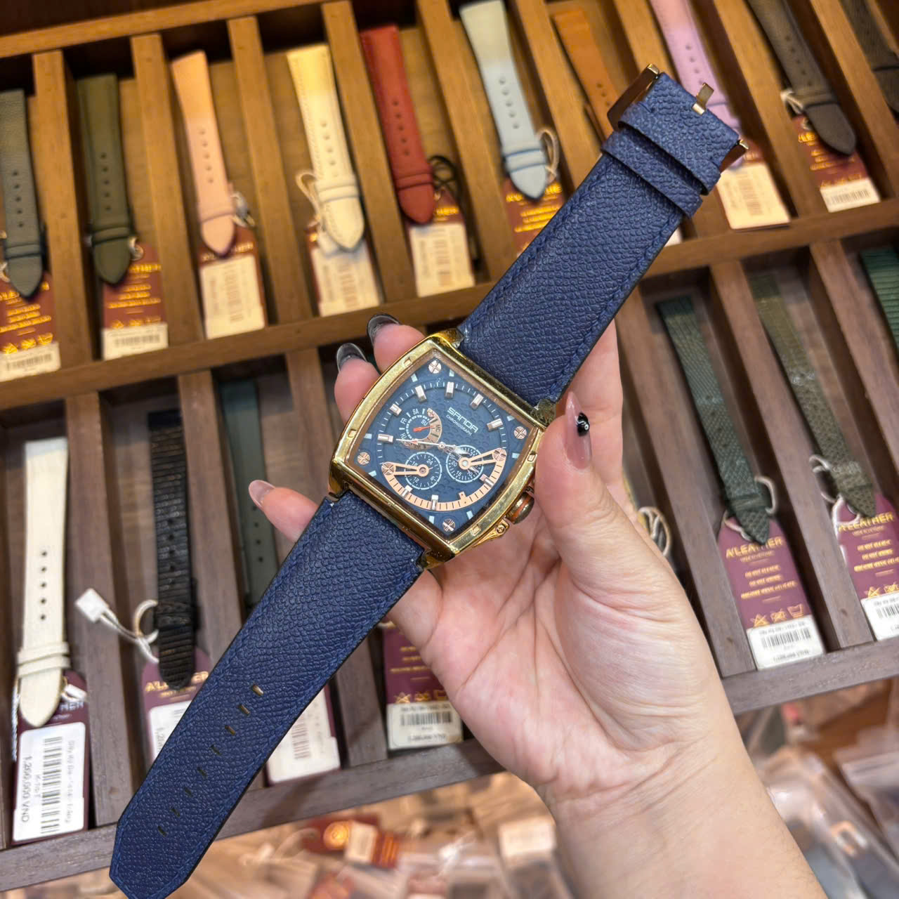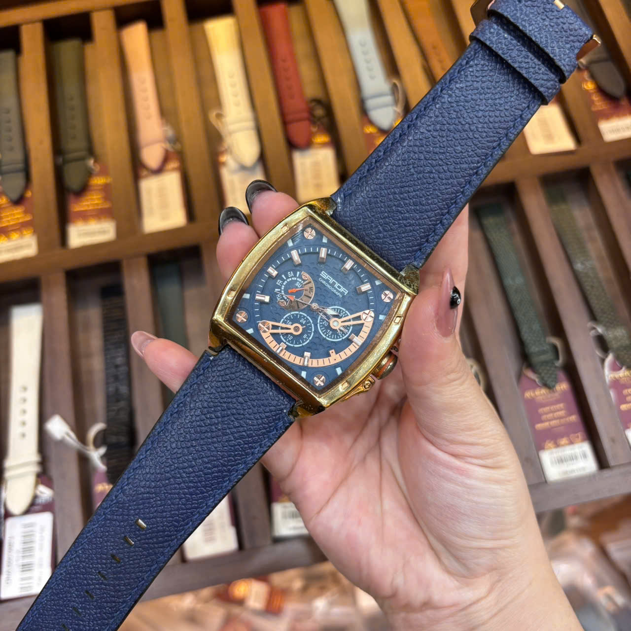 Dây Đồng Hồ Sanda Quartz nam Da Bò màu Xanh