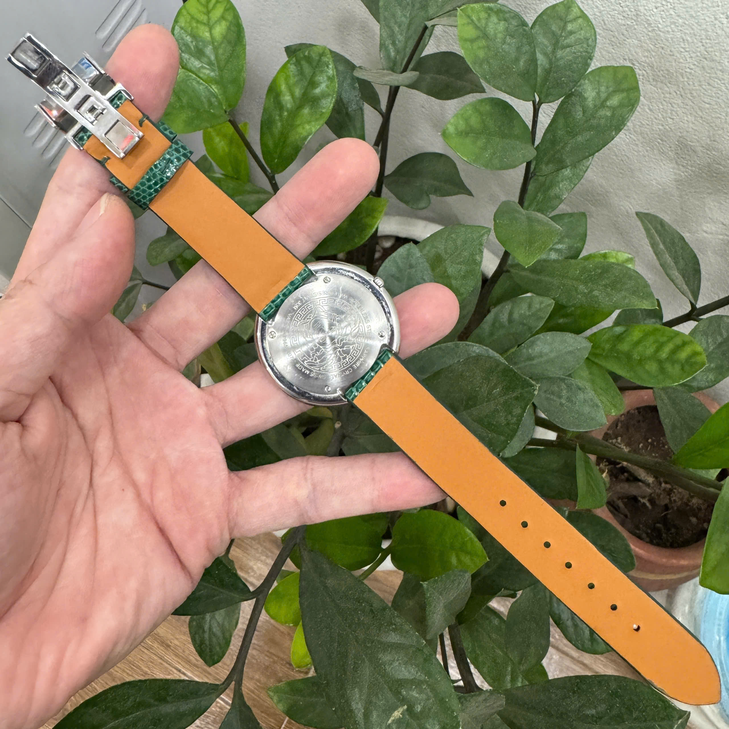 Dây được hoàn thiện tỉ mỉ không có đường chỉ thanh lịch, đảm bảo độ ôm cổ tay tự nhiên và thoải mái, được giữ lại 2 logo trên dây tạo điểm nhấn vốn có. Khi kết hợp cùng Versace Thea Diamond Da kỳ đà màu xanh Lá, dây giúp tổng thể đồng hồ trở nên sang trọng, cuốn hút và mang phong thái đẳng cấp đặc trưng của Versace.