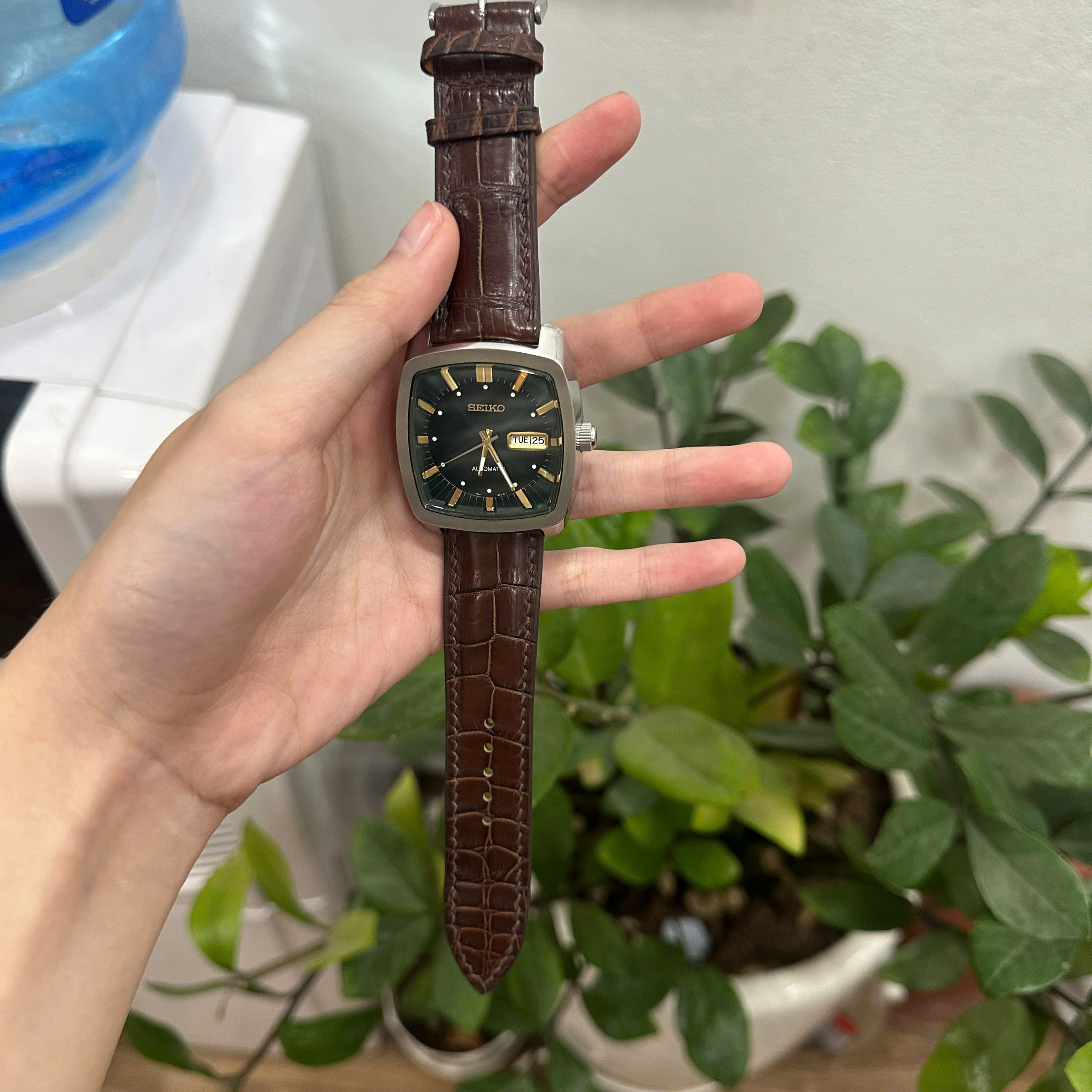 Dây đồng hồ Seiko Recraft Series Automatic SNKP27 màu nâu được chế tác từ da cá sấu thật, mang lại vẻ đẹp sang trọng và tinh tế cho chiếc đồng hồ mặt vuông bo cong đặc trưng của dòng Seiko. Phần vân cá sấu sắc nét, nổi khối tự nhiên giúp tổng thể dây thêm phần đẳng cấp và thời thượng.